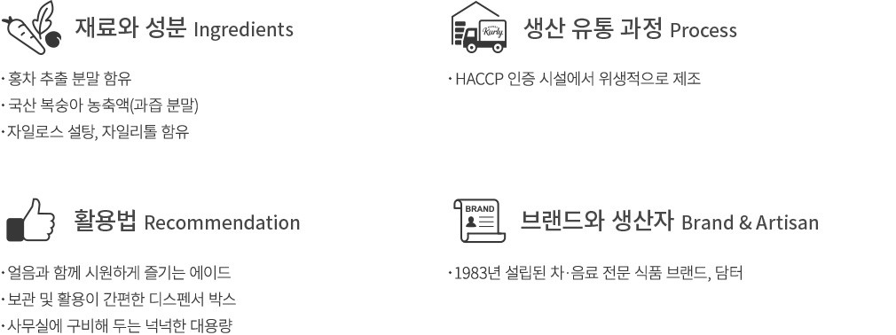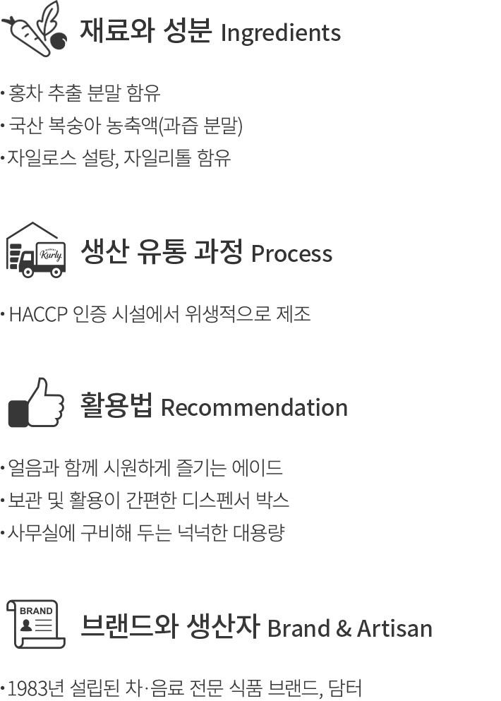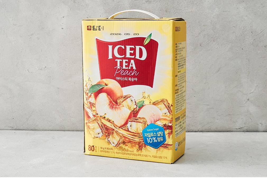 풍요로운 일상을 선사하는 한잔의 차,담터를 만나 보세요. 지금 소개하는 담터의 제품은 향긋하고 달콤하게 즐기는 복숭아 아이스티 분말 스틱이에요. 국산 복숭아 농축액으로 복숭아의 산뜻한 향미를 오롯이 담아냈고요. 설탕과 함께 자일로스 설탕을 사용해 깔끔하고 청량한 단맛을 내었답니다. 찬물에도 잘 녹으니,얼음을 가득 넣어 시원하게 즐겨 보세요. 넉넉한 대용량이라 더욱 든든할 거예요.