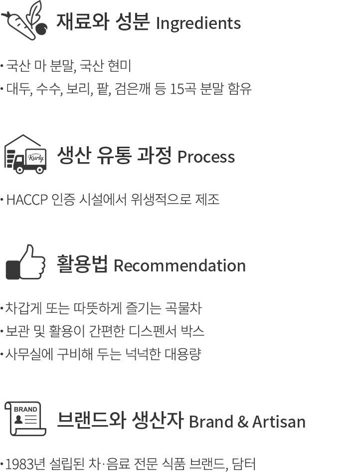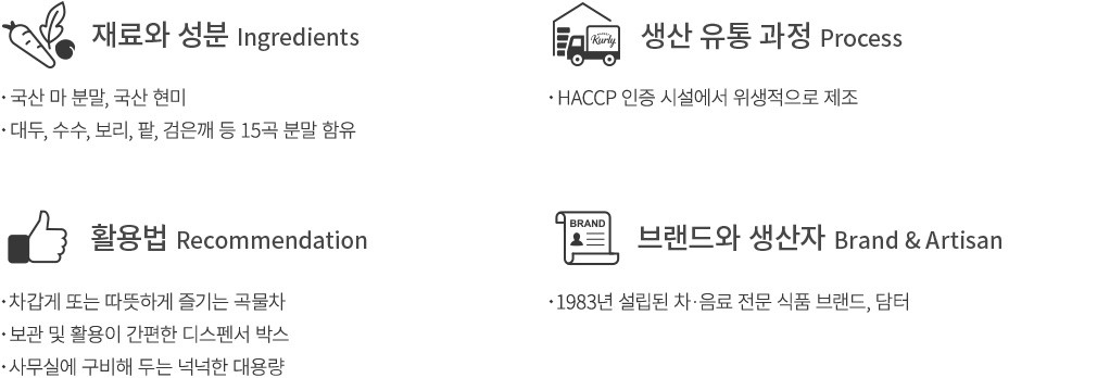 풍요로운 일상을 선사하는 한잔의 차,담터를 만나 보세요. 지금 소개하는 담터의 제품은 다채로운 곡물로 고소하고 든든하게 완성한 미숫가루 분말 스틱이에요. 국산 마 분말을 비롯해 율무,귀리,강낭콩,조,기장 등 15가지의 곡물 분말을 더했답니다. 담백하면서도 부드러운 목넘김으로 누구나 부담 없이 드시기 좋지요. 찬물에도 잘 녹으니 취향에 맞도록 시원하게,또는 따뜻하게 즐겨 보세요. 넉넉한 대용량이라 더욱 든든할 거예요.