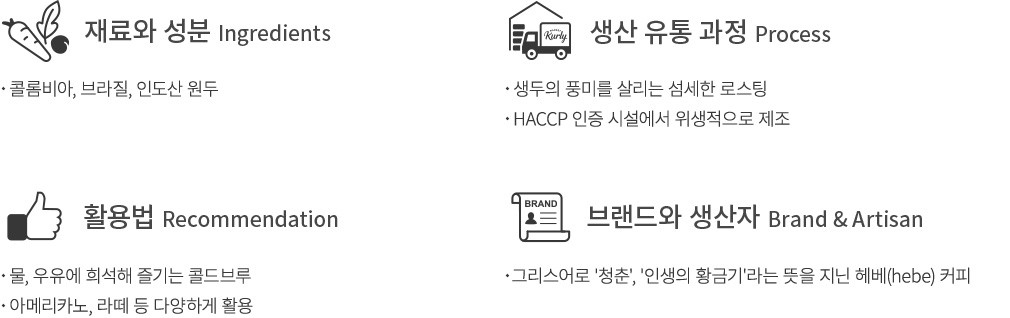 헤베커피는 최근 커피 씬에서 주목하고 있는 스페셜티 커피 매장으로,서울시 중구에 위치하고 있어요. 헤베커피의 오너인 임지영 바리스타는 한국 브루어스컵 국가대표 선발전 등 다양한 대회의 수상 경력을 지닌 실력 있는 바리스타인데요. 그는 매장을 찾는 손님들께 푸르른 봄과 같은 활력을 공유하고 싶다는 마음에서 가게 이름을 그리스어로 '청춘','인생의 황금기'라는 의미의 'hebe'라 지었답니다. 다양한 채널을 통해 고객과의 소통을 이어나가고자 하는 헤베커피를 이제 컬리에서 만나보세요.