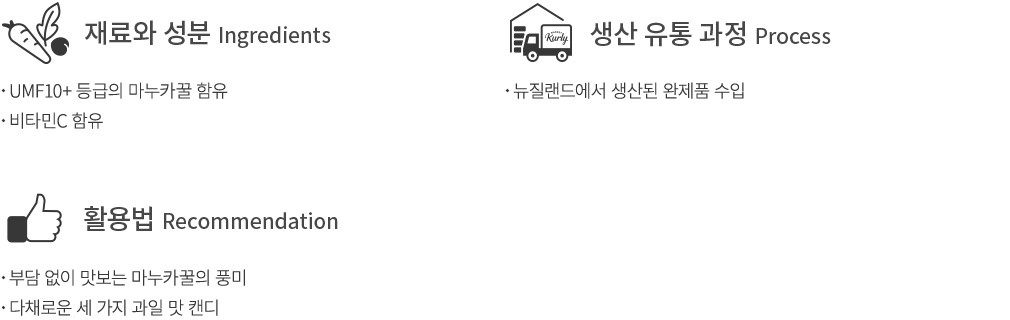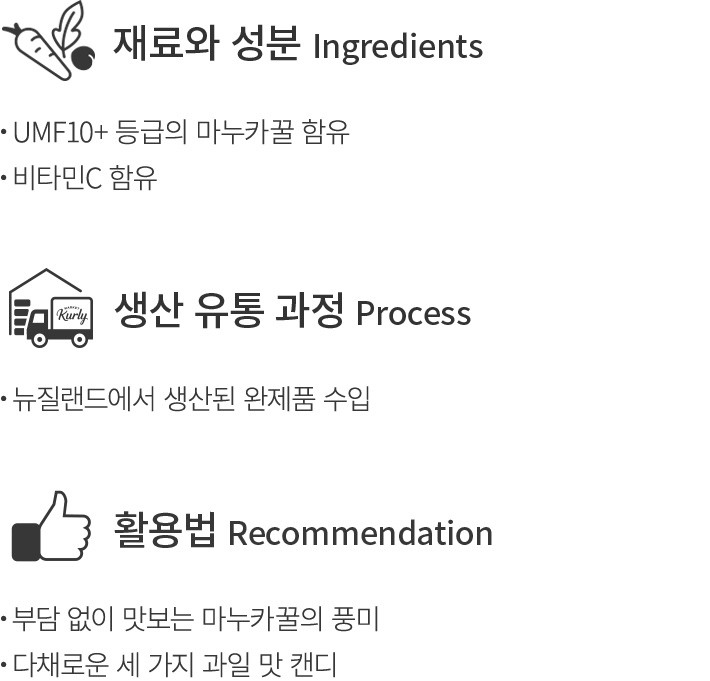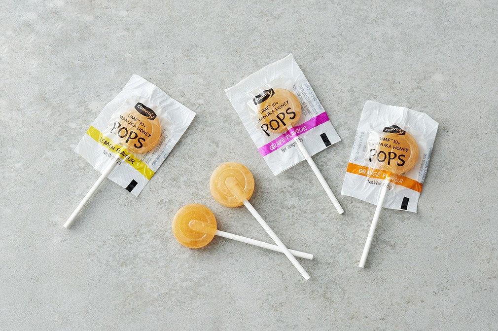뉴질랜드에서 자라는 마누카 꽃의 꿀을 채취해 담은 캔디를 소개합니다. 마누카꿀 협회의 엄격한 테스트를 거쳐 정식으로 수출을 허가받은 UMF(Unique Manuka Factor) 승인을 받은 UMF10+ 등급의 마누카꿀을 넣어 만들었어요. 시럽과 천연 향료를 더해 아이들도 편안하게 먹기 좋은 달콤한 맛으로 완성했답니다. 롤리팝 형태로 1개씩 개별 포장되어 있으니 가방에 쏙 넣어 다니기에도 제격이고요. 레몬 맛,포도 맛,오렌지 맛까지 3가지 맛을 담았으니 하나씩 골라서 즐겨도 참 좋을 거예요.