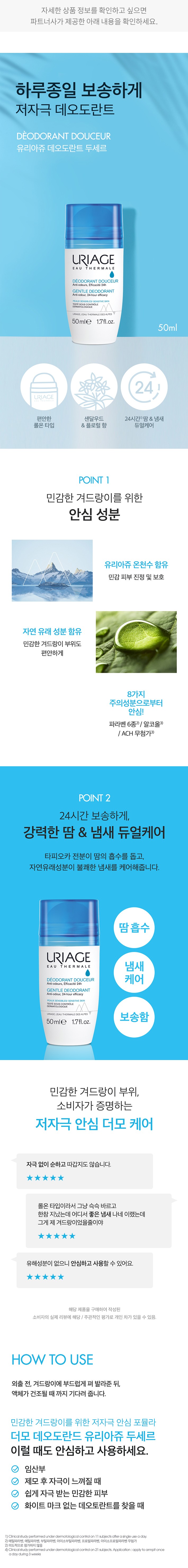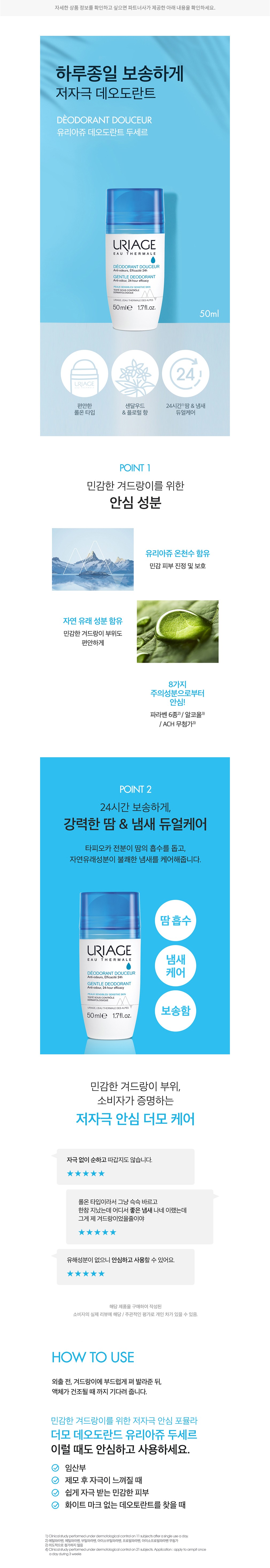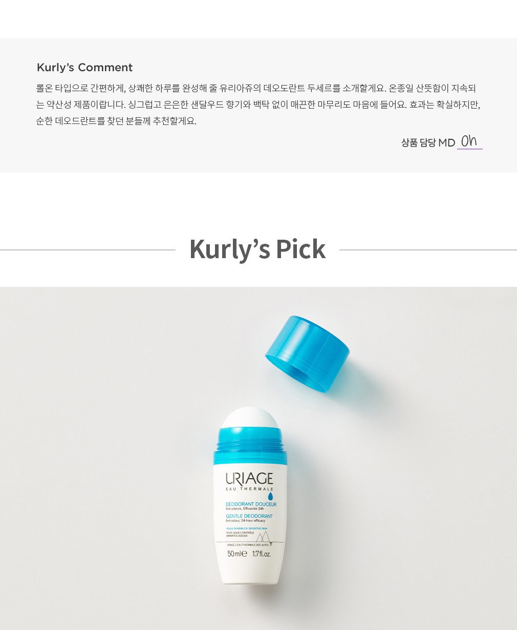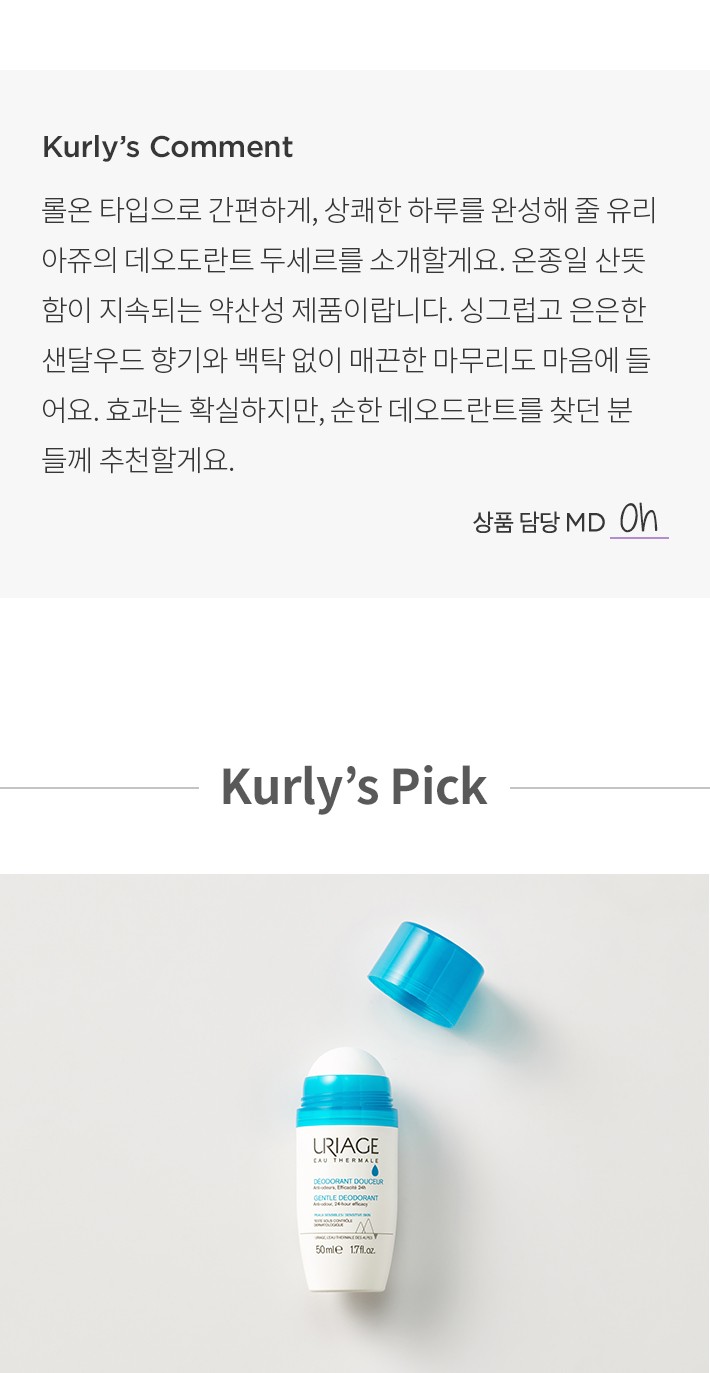 ・ 특징:부드럽게 펴 발리는 롤온 타입 데오드란트예요. 순한 사용감을 전하는 약산성 제품입니다.
