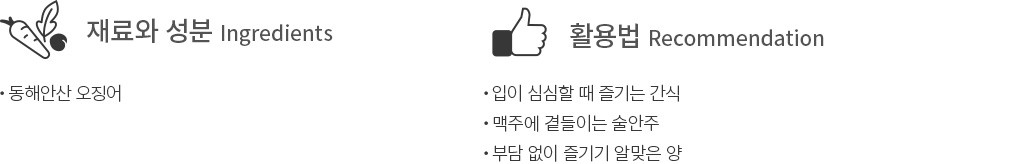 동해안에서 잡은 오징어는 싱싱하고 살이 부드러워 담백한 감칠맛이 뛰어나요. 이 맛있는 동해안 오징어를 수산곳간이 깔끔하게 손질하고 말렸답니다. 도톰한 두께감을 살렸기에 쫄깃한 식감을 제대로 즐길 수 있어요. 씹으면 씹을수록 배어나는 고소하고 담백한 감칠맛도 무척 만족스럽죠. 부담 없이 드시기 좋은 2미 구성이니,간단한 간식 혹은 안주로 선택해 보세요. 앞뒤로 살짝 구워 드시거나,취향에 따라 마요네즈나 고추장을 곁들여도 좋을 거예요.