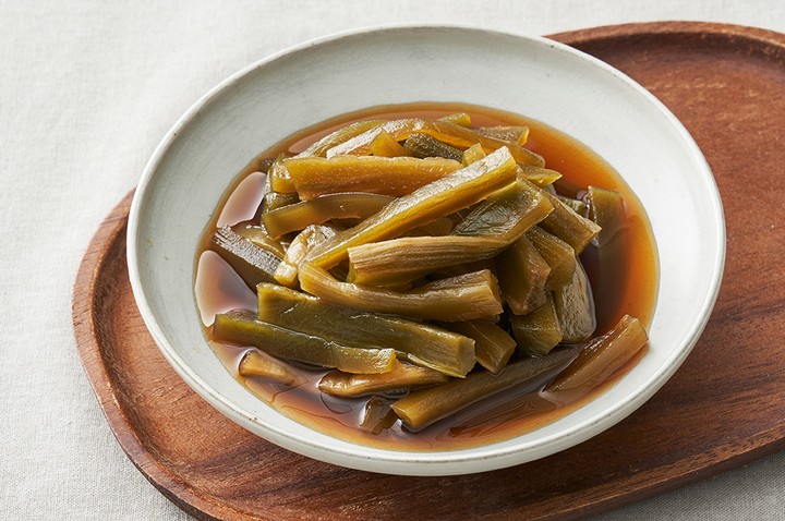 강원도 향토 음식의 대가,권영원 장인의 손길이 닿은 요리로 장아찌를 빼놓을 수 없어요. 재료 본연의 신선함을 잃지 않으면서도,제대로 담근 숙성 음식만의 깔끔한 감칠맛이 깊숙이 배어 있기에 입맛을 끌어당기기에 충분하죠. 이번에는 오독오독한 식감이 매력적인 별미 반찬,궁채장아찌를 준비했어요. 한입 크기로 손질한 궁채나물을 권영원 장인만의 특제 간장 소스에 숙성했는데요. 채수와 과일 액기스를 사용해 자연스러우면서도 깊이 있는 감칠맛을 자랑한답니다.