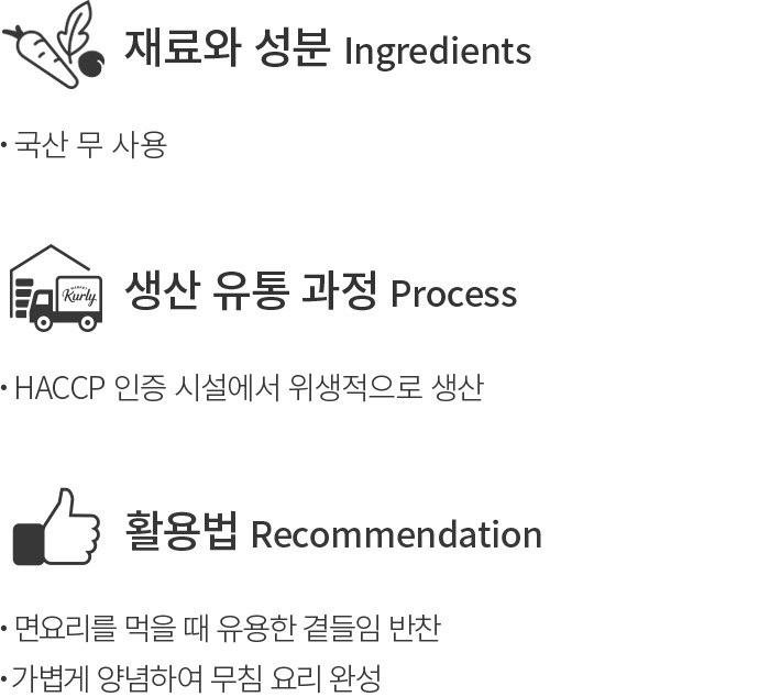 ・주요 원재료:절임무[무(국산) 97%,천일염(호주산)] 93.5%,발효식초(주정,발효영양원),정제소금(국내산),치자황색소 등