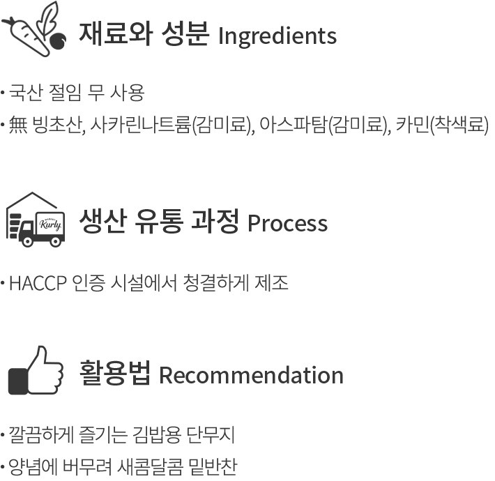 갖가지 재료를 넣은 김밥에 노오란 단무지가 빠지면 섭섭하죠. 하선정이 만든 김밥 단무지로 온 가족을 위한 맛있는 김밥을 준비해 보세요. 국산 절임무를 사용해 아삭함이 남다른 상품인데요. 기분 좋은 식감은 물론,새콤달콤한 맛이 입맛을 제대로 살려준답니다. 작게 토막을 낸 뒤 양념에 알맞게 버무려,간단 밑반찬으로도 활용해도 좋을 거예요.