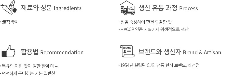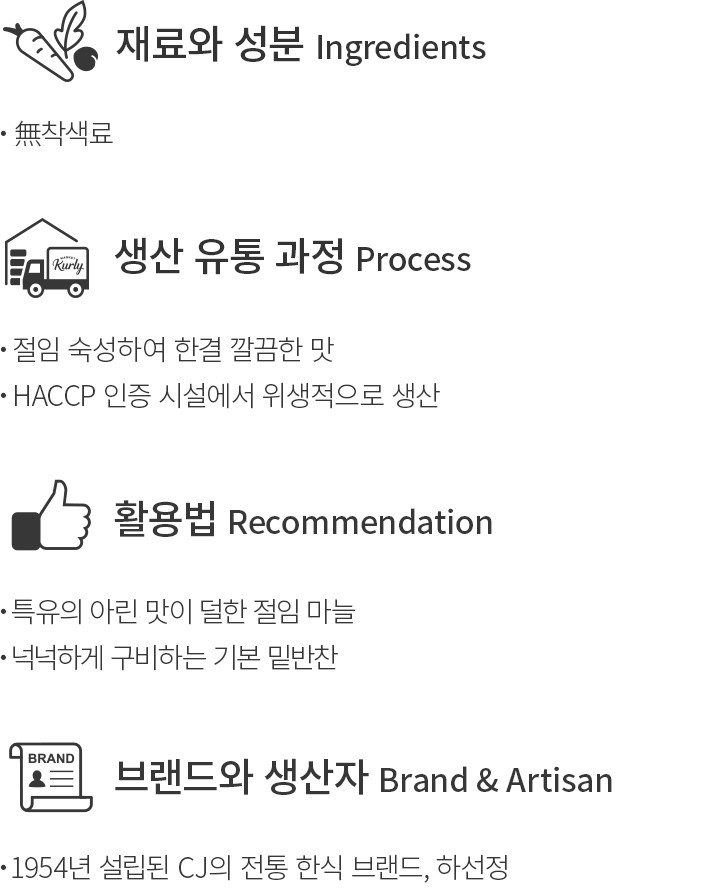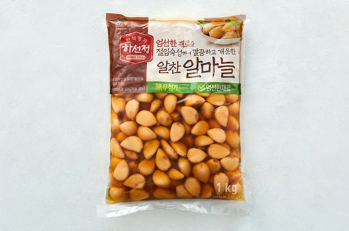 알맞게 절인 마늘은 어떤 음식과도 깔끔한 궁합을 자랑하죠. 간단한 밥반찬은 물론이고,기름진 고기나 찌개 등의 요리와도 무척 잘 어울리는데요. 한식명가,하선정이 알마늘을 든든하게 구비하고 두루 활용할 수 있는 용량으로 준비했어요. 마늘 한 알 한 알을 꼼꼼히 손질한 뒤,새콤 짭짤한 양념에 충분히 담가 만들었답니다. 절임 숙성 과정을 거친 덕분에 아린 맛이 덜하고 끝맛까지 개운할 거예요.