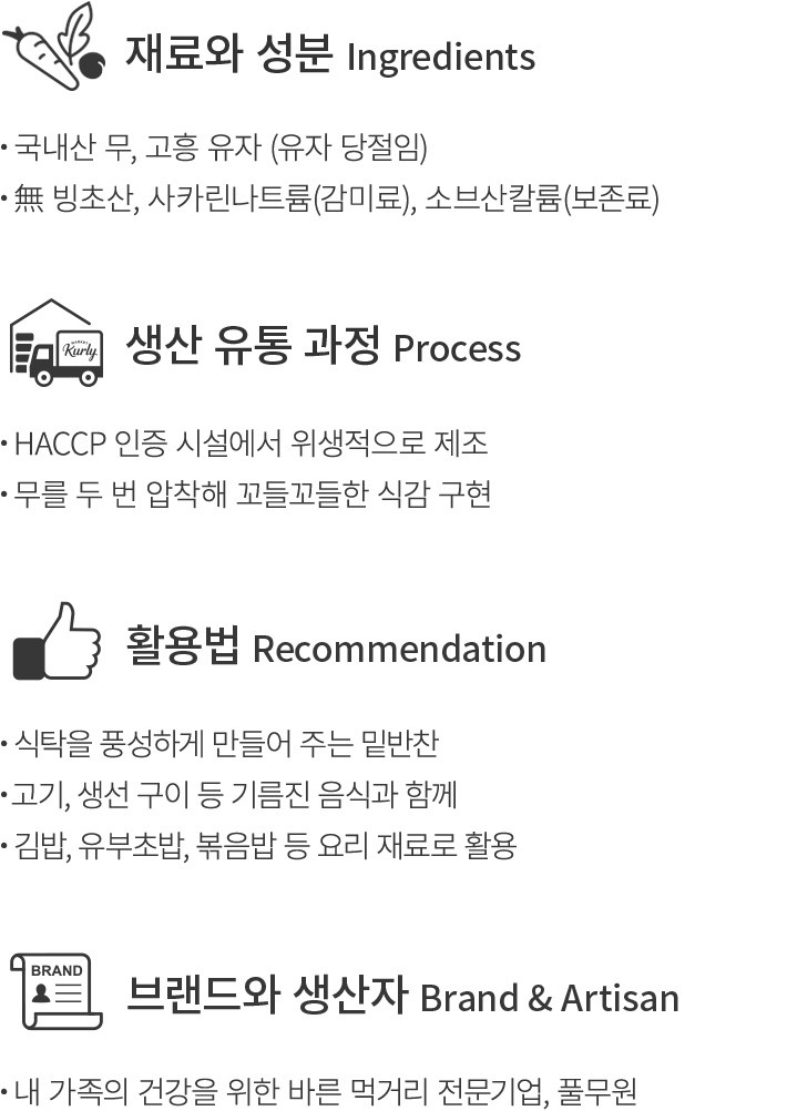 오독오독 입안에서 재미난 식감을 뽐내는 무 장아찌,언제나 식탁에서 환영받는 별미 반찬이지요. 풀무원은 국내산 무를 두 번 압착해 꼬들꼬들한 식감을 제대로 살린 꼬들무 장아찌를 선보입니다. 지금 소개하는 상큼유자 꼬들무 장아찌는 양념에 국내산 유자,레몬 농축액을 사용해 향긋하게 완성한 제품이에요. 다양한 음식과 곁들이는 밑반찬은 물론이고요. 김밥,볶음밥 등 요리에 활용하면 존재감을 톡톡히 발휘한답니다.