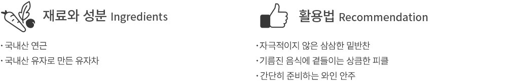 둥구나무:자연그대로는 바른 먹거리에 대한 꿈을 가진 부부의 마음에서 출발했어요. 전국 각지에서 찾아온 신선한 재료로 밥상을 더욱 풍성하게 꾸며줄 다양한 반찬을 만들죠. 이번에는 둥구나무의 연근유자피클을 소개할게요. 아삭한 식감의 국내산 연근과 유자편을 함께 절여 숙성했어요. 간수를 뺀 볶은 소금으로 간을 맞추어 삼삼하면서도 상큼하고 시원한 맛이 일품이랍니다. 둥구나무라는 이름처럼 밥을 먹는 그 순간만큼은 편안하게 쉬어 보세요.