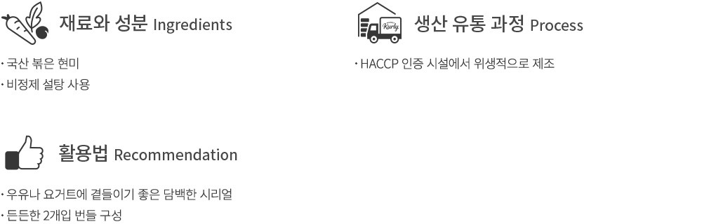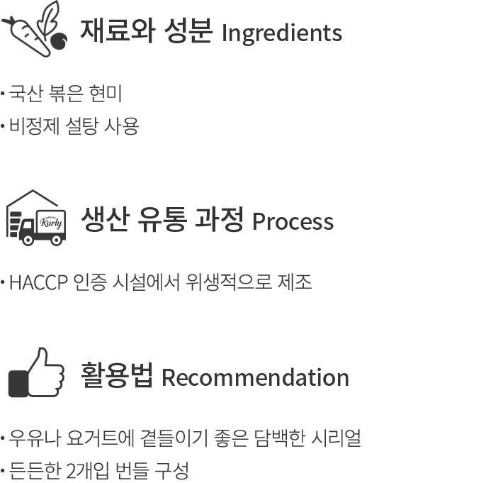정갈한 영양 간식을 선보이는 브랜드,소하동고방의 현미 시리얼을 만나 보세요. 국산 볶은 현미로 만들어 구수하고 끝맛이 깔끔하답니다. 비정제 설탕과 아몬드 슬라이스,건조 크랜베리로 상큼한 매력과 바삭한 식감을 더했고요. 소하동고방이 정성껏 만들었으니 믿고 드셔 보세요. 우유나 요거트에 곁들여 간단한 아침이나 든든한 간식으로 즐기면 딱 좋을 거예요.