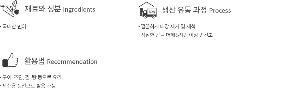 생선을 말리면 특유의 맛과 풍미가 더욱 깊어지죠. 이번에 소개할 민어도 그렇습니다. 국내산 민어를 반으로 갈라 내장을 제거하고 살짝 말렸어요. 덕분에 살이 좀 더 쫀득해지고 담백한 감칠맛도 한층 풍부해졌지요. 국산 천일염을 알맞게 염장해 자연스러운 간도 스며들어 있답니다. 구이,조림 등 다양한 요리에 활용해 보세요. 무,미나리 등을 넣고 민어탕을 끓이면 풍요로운 한 상이 완성될 거예요.