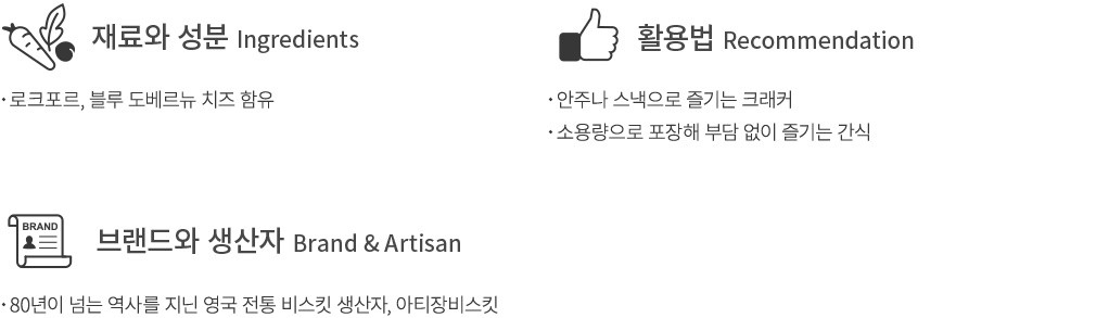 수제의 가치,지역에서 난 식재료 그리고 디테일이 주는 완성도. 영국 중부 더비셔 주에 위치한 아티장비스킷을 말하는 세 가지 철학이에요. 80년의 역사를 지닌 이곳은 시간의 켜가 쌓인 공방에서 대대로 내려온 비스킷 몰드와 롤러를 사용해 아티장이라는 이름에 걸맞는 비스킷을 만들어오고 있어요. 영국 내에서도 가장 전통 방식 그대로,가장 영국적인 비스킷을 만드는 생산자로 널리 알려져 있지요. 컬리가 소개하는 아티장비스킷은 그저 그런 비스킷이 아닌,원재료 그 자체의 맛 그리고 치즈의 다채로움을 더욱 빛나게 만들어준답니다.