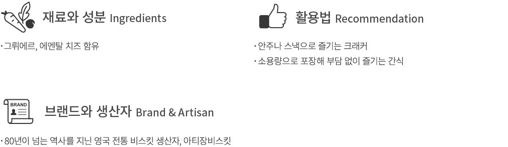 치즈를 특별하게 즐길 수 있는 방법은 무궁무진해요. 그중에서도 하나를 꼽자면 치즈를 활용한 스낵을 맛보는 거예요. 컬리가 소개하는 아티장비스킷의 치즈 크래커는 스위스 대표하는 치즈,그뤼에르와 에멘탈 치즈를 사용해 만든 스낵이에요. 80년의 역사와 기술을 지닌 아티장비스킷은 밀가루 반죽 속에 치즈 함유량을 33%나 더해 개성 넘치는 맛과 풍미를 고스란히 표현했답니다. 바삭한 크래커를 한 입 먹으면 짭짜름한 감칠맛과 함께 과일과 견과류의 향미가 느껴지지요. 그 자체로 스낵처럼 즐겨도 좋지만 맥주나 와인과 곁들여 즐겨 보세요.