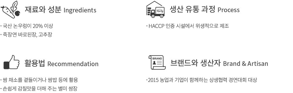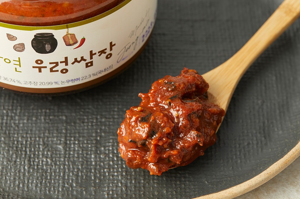 한식의 기본이 되는 전통 장은 원료와 환경,숙성 방식에 따라 그 맛이 천차만별이죠. 수 시간의 정성을 들여 만든 죽장연의 장에는 흉내 낼 수 없는 깊은 맛이 녹아있는데요. 이번에는 죽장연의 비법으로 완성한 된장,고추장에 논우렁이를 더해 만든 우렁 쌈장을 소개할게요. 국산 논우렁이를 사용해 부드러우면서도 쫄깃한 식감이 일품이고요. 담백하면서도 구수한 감칠맛을 품고 있어 더욱 매력적이랍니다. 쌈밥을 위한 양념장부터 강된장 등으로 다양하게 활용해 보세요.