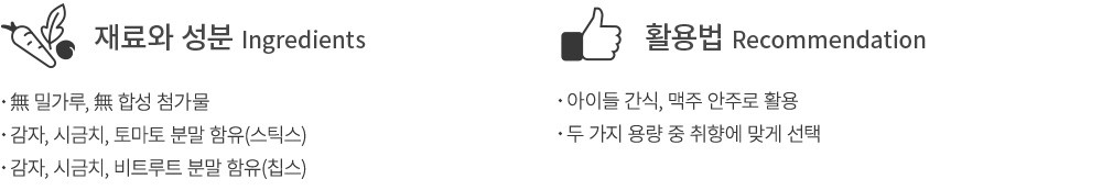 ・특징:깔끔하게 한입에 쏙 들어가는 스틱형 스낵입니다. 온 가족이 먹기 좋은 용량이에요.
