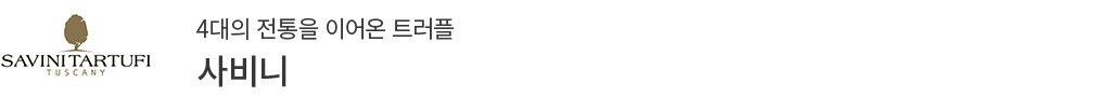 1920년 GIUSEPPE Savini가는 이탈리아 토스카나 지방에서 생산된 트러플을 세상에 소개한 이래로 4대에 걸쳐 전통을 이어오고 있지요. 신선함 유지를 최우선으로 생각해 선주문 후생산 시스템을 고수하며 고품질의 제품들을 생산하고 있어요. 그렇게 만들어진 제품 가짓수만 80여 개인데요. 폭넓은 제품 라인업 또한 사비니만의 장점이라고 할 수 있지요. 이탈리아에서는 사비니의 트러플 제품만을 사용하는 레스토랑이 있을 정도로 현지 셰프들의 애정을 듬뿍 받는 브랜드이며,40개국에 수출하며 전 세계에 토스카나의 트러플을 알리는 세계적인 브랜드이기도 합니다.