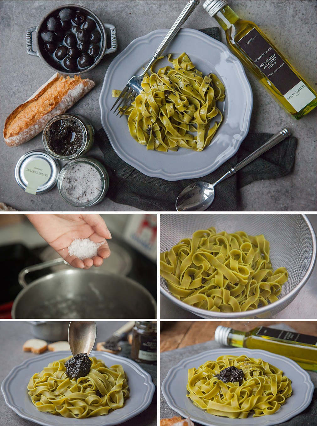 2. 면을 접시에 담고 트러플 올리브 소스 1~2큰 술과 트러플 소금 한 꼬집을 넣은 후 잘 섞는다.